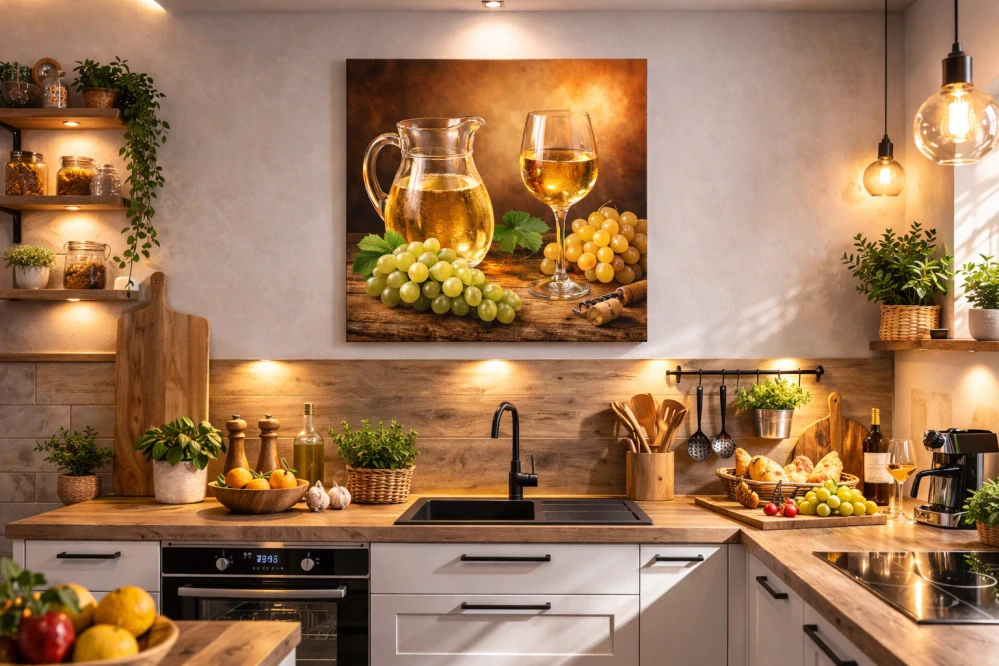 Tento fotoobraz zachycuje stylovou kompozici skleněného džbánku s bílým vínem a hroznového vína. Teplé barevné pozadí a jemné světlo vytvářejí sofistikovanou, večerní atmosféru.
