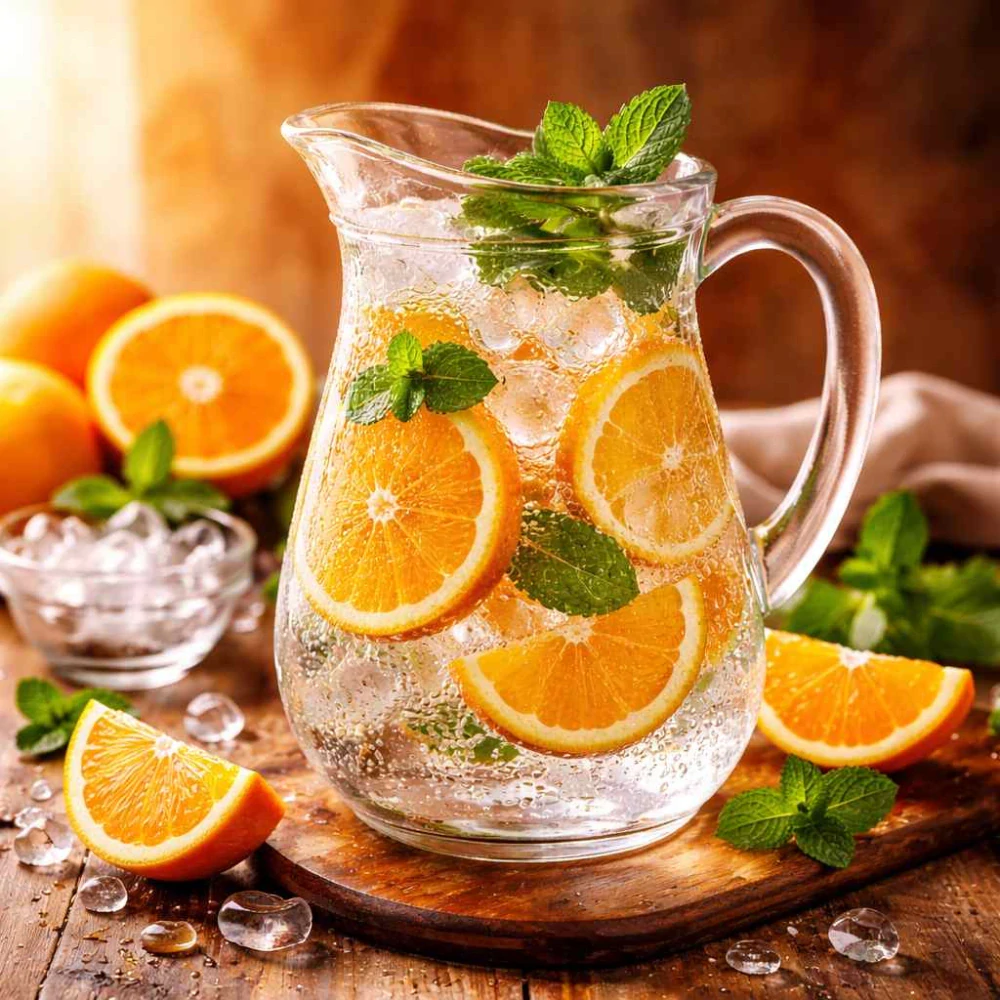 Stylový fotoobraz s motivem perlivé vody, plátků pomeranče, kostek ledu a čerstvé máty. Teplé barevné ladění dodává prostoru útulnost, zatímco detailní provedení působí moderně a luxusně.