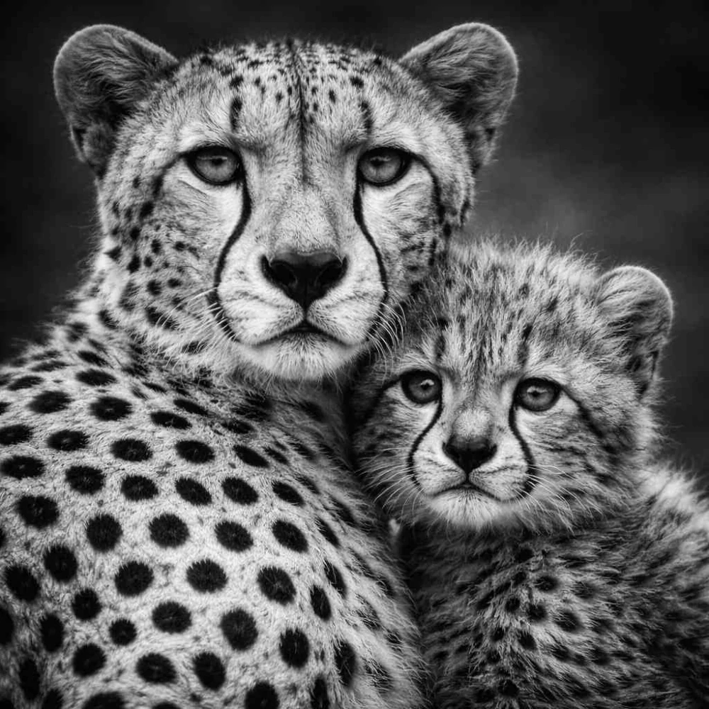Černobílý fotoobraz zachycující geparda s mládětem spojuje kontrast síly a něhy. Ostré rysy dospělého geparda a hebká struktura mláděte vytváří vizuálně velmi silnou kompozici. Obraz působí luxusně, sebevědomě a zároveň emotivně. Skvěle doplní moderní i industriální interiéry a stane se dominantou prostoru.