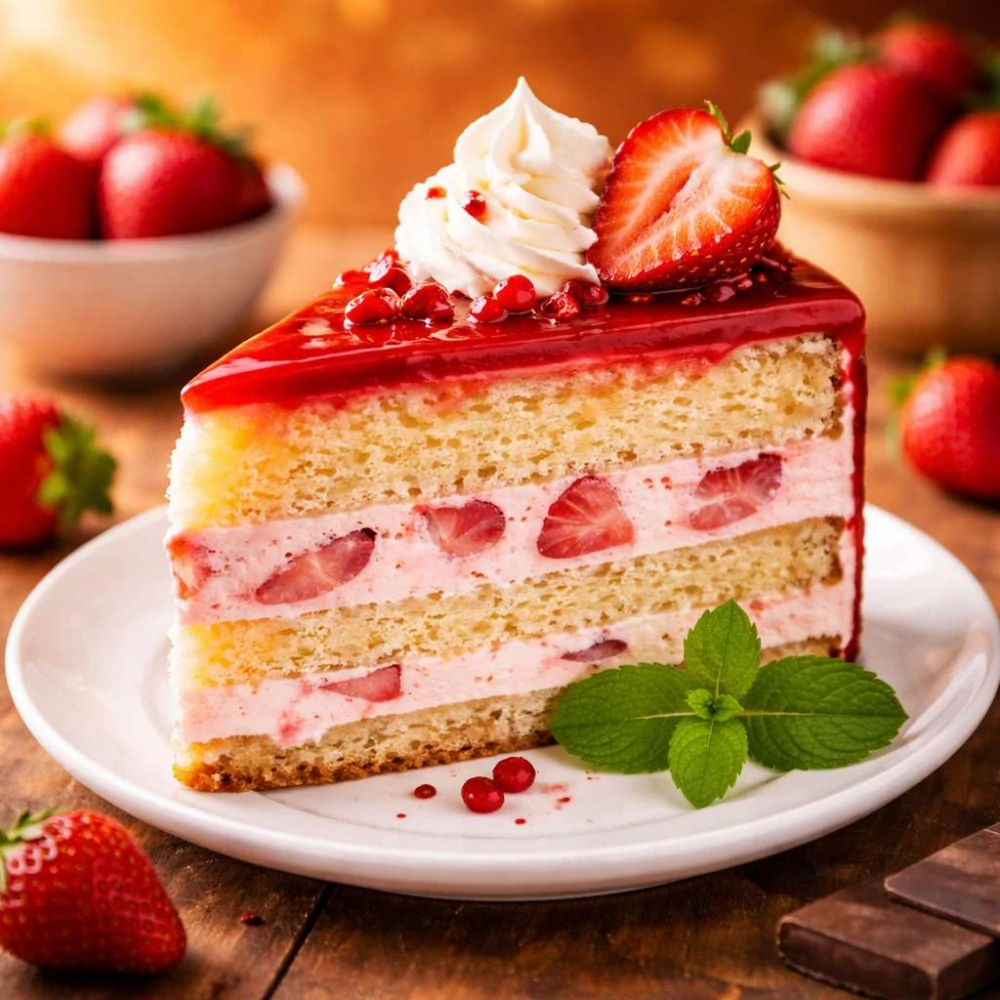 Tento fotoobraz zachycuje lahodný klínek jahodového dortu naservírovaný na bílém talíři s jemným lístkem meduňky. Teplé barevné tóny a detailní zpracování vytvářejí příjemnou, útulnou atmosféru a podtrhují svěžest i sladkost dezertu.