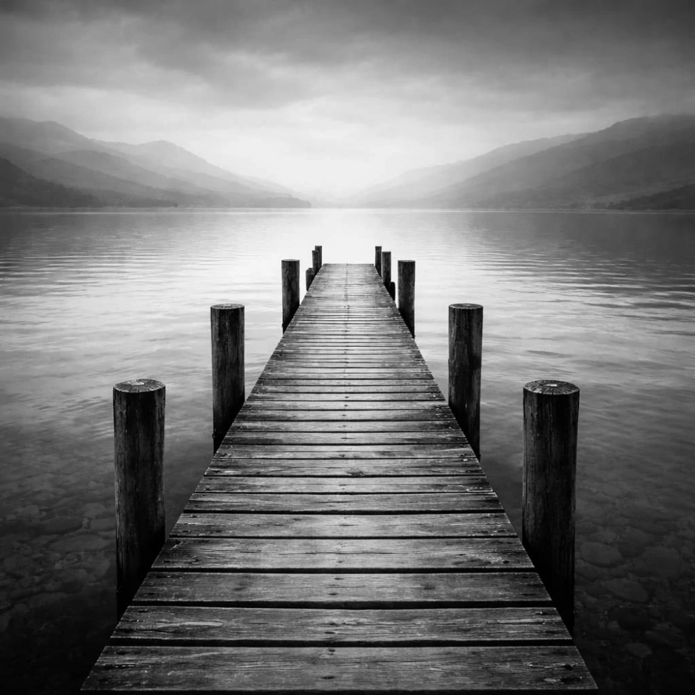 Tento černobílý fotoobraz zachycuje molo vedoucí do klidné hladiny jezera, obklopené jemnou mlhou a siluetami hor v dálce. Minimalistická kompozice a jemné přechody světla vytvářejí pocit ticha, prostoru a vnitřního klidu.