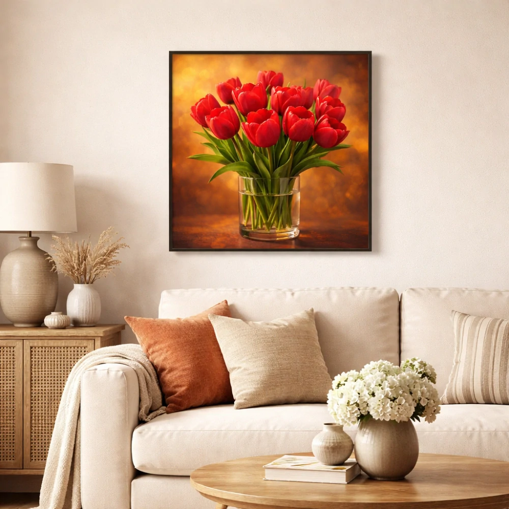 Sytě červené tulipány symbolizují radost, eleganci a nové začátky. Teplé barevné tóny fotografie vytvářejí příjemnou atmosféru a přinášejí do interiéru pocit klidu a harmonie.