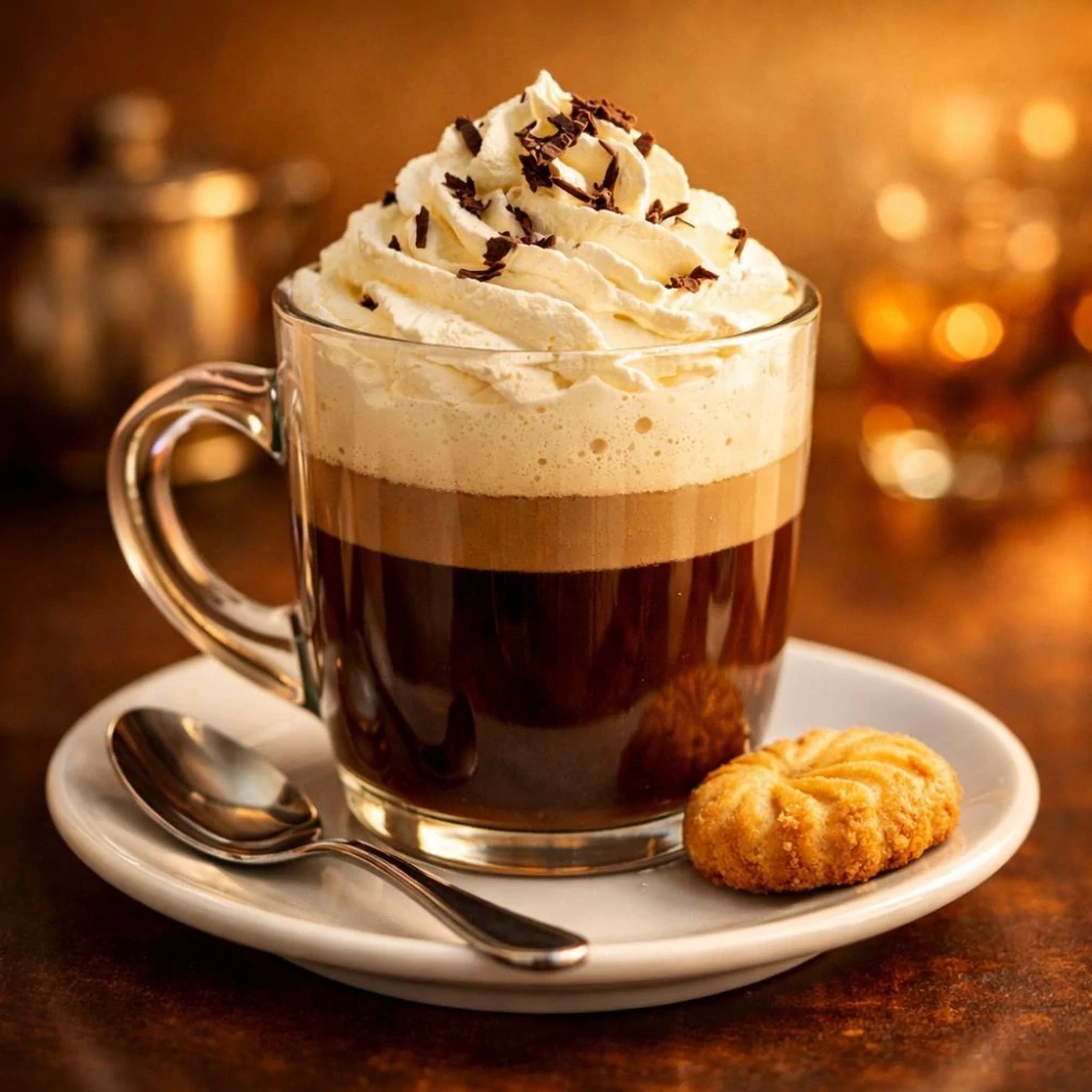 Tento fotoobraz zachycuje ikonickou Vídeňskou kávu ve skleněné sklenici s ouškem, doplněnou o malou sušenku na bílém talířku. Teplé barevné ladění a jemné světlo vytvářejí pocit útulnosti, elegance a klidu, typický pro tradiční kavárenskou atmosféru.