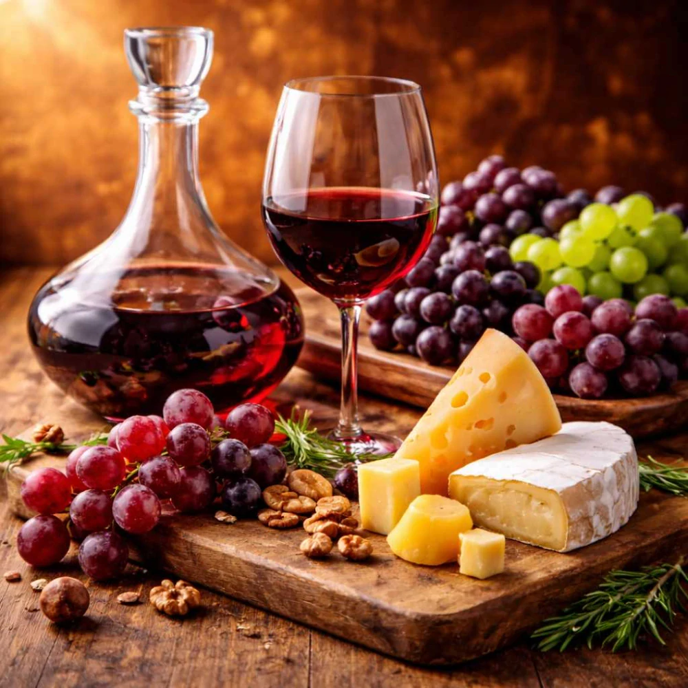 Tento fotoobraz zachycuje stylovou kompozici karafy červeného vína, sklenice, hroznového vína a vybraných sýrů na dřevěném prkénku. Teplé barevné pozadí a jemné světlo vytvářejí sofistikovanou, večerní atmosféru.