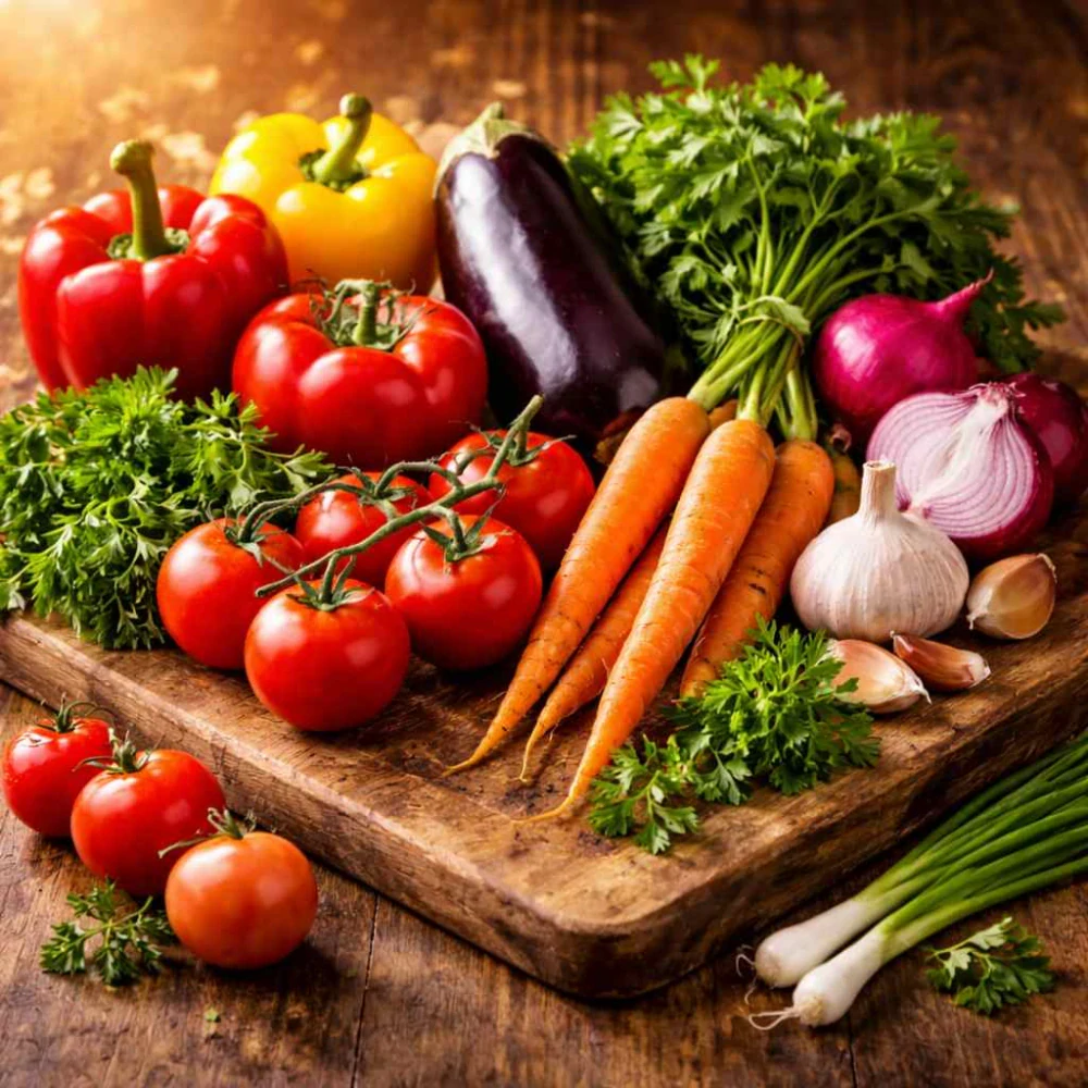 Tento fotoobraz představuje bohatou kompozici čerstvé zeleniny – papriky, rajčata, lilek, mrkev, cibuli, petržel a další plody přírody. Dřevěné prkénko a teplé světlo dodávají obrazu přirozený, rustikální charakter.